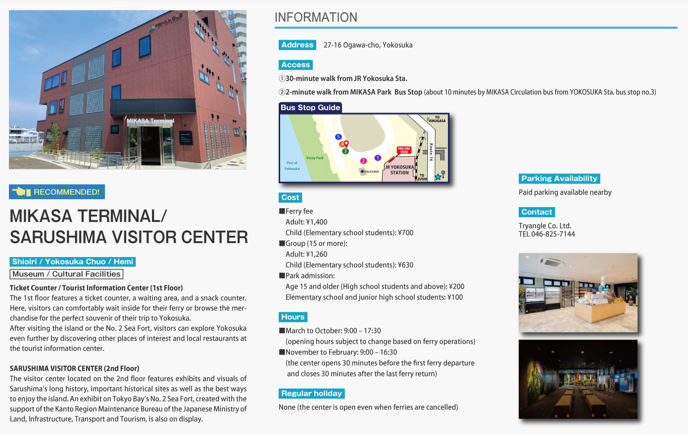 Museum, culture facility Oppama, Taura Shioiri, Yokosuka-Chuo, Hemi Kinugasa Hashirimizu, Kannonzaki, Otsu, Uraga Akiya, Sajima, Takeyama Kurihama Nagai, Arasaki Nobi, Nagasawa, Tsukuihama Park, open space Nature Museum, culture facility Warm bath, hot spring Outdoor, experience Famous place, histric site Others Japan Heritage Hiking Cource