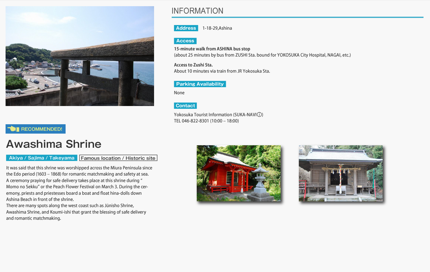 Akiya, Sajima, Takeyama Oppama, Taura Shioiri, Yokosuka-Chuo, Hemi Kinugasa Hashirimizu, Kannonzaki, Otsu, Uraga Akiya, Sajima, Takeyama Kurihama Nagai, Arasaki Nobi, Nagasawa, Tsukuihama Park, open space Nature Museum, culture facility Warm bath, hot spring Outdoor, experience Famous place, histric site Others Japan Heritage Hiking Cource