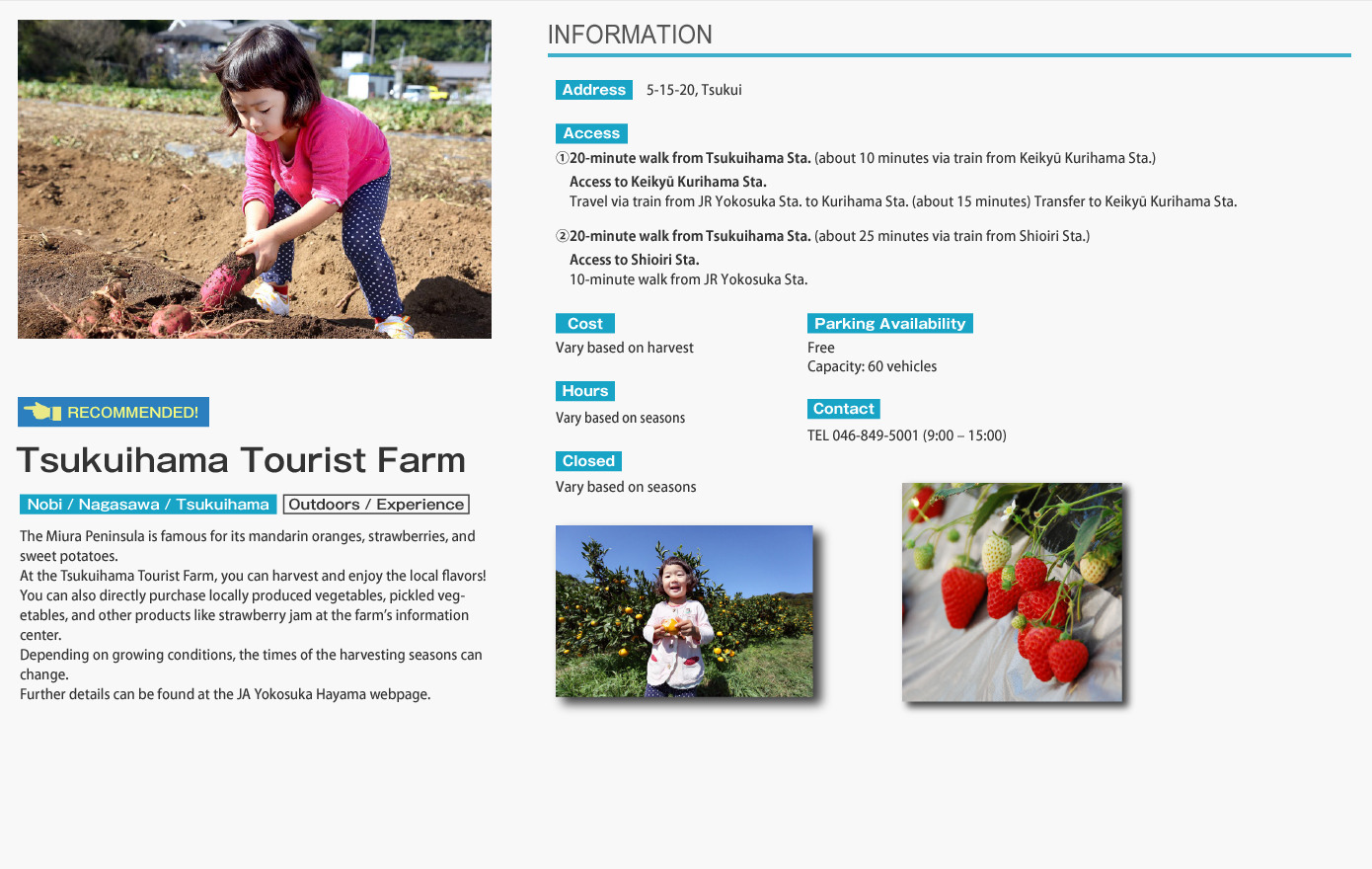 Nobi, Nagasawa, Tsukuihama Oppama, Taura Shioiri, Yokosuka-Chuo, Hemi Kinugasa Hashirimizu, Kannonzaki, Otsu, Uraga Akiya, Sajima, Takeyama Kurihama Nagai, Arasaki Nobi, Nagasawa, Tsukuihama Park, open space Nature Museum, culture facility Warm bath, hot spring Outdoor, experience Famous place, histric site Others Japan Heritage Hiking Cource