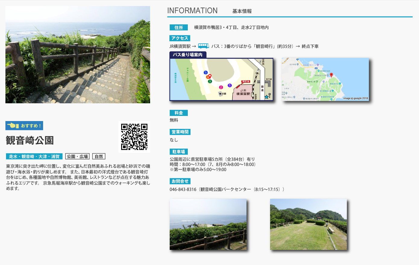 走水・観音崎・大津・浦賀 追浜・田浦 汐入・横須賀中央・逸見 衣笠 走水・観音崎・大津・浦賀 秋谷・佐島・武山 久里浜 長井・荒崎 野比・長沢・津久井浜 公園・広場 自然 資料館・文化施設 温浴・温泉 アウトドア・体験 名所・旧跡 その他 日本遺産 ハイキングコース