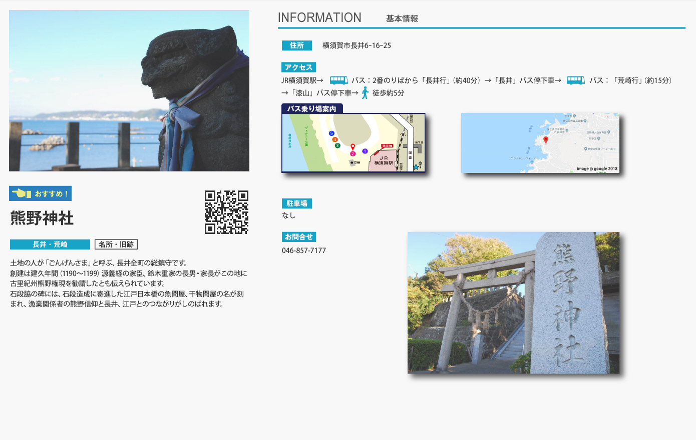 長井・荒崎 追浜・田浦 汐入・横須賀中央・逸見 衣笠 走水・観音崎・大津・浦賀 秋谷・佐島・武山 久里浜 長井・荒崎 野比・長沢・津久井浜 公園・広場 自然 資料館・文化施設 温浴・温泉 アウトドア・体験 名所・旧跡 その他 日本遺産 ハイキングコース